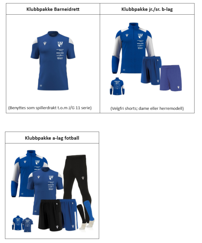 - Klubben dekker klubbpakke iht beskrivelse i plansje nedenfor. Tildelt klubbpakke er til privat eie. I tillegg holder klubben drakter til alle lag/spillere. Ta kontakt med trener dersom du ikke har drakt. Forutsetning for tildeling av klubbpakke er at utøver har gyldig medlemskap.